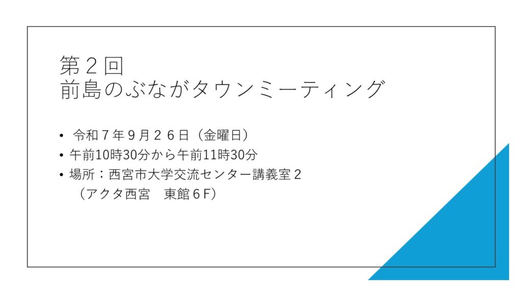 第2回タウンミーティングのお知らせ 2025.09.25 いつもお世話になります。 第2回前島のぶながタウンミーティングを以下のとおり開催させていただきます。 今回のテーマは、「振り込め詐欺の対策と消費者被害」についてです。 ぜひ、ご参加いただきますよう宜しくお願い致します。 • 令和7年9月26日(金曜日) •午前10時30分から午前11時30分 •場所:西宮市大学交流センター講義室2 (アクタ西宮 東館6F)