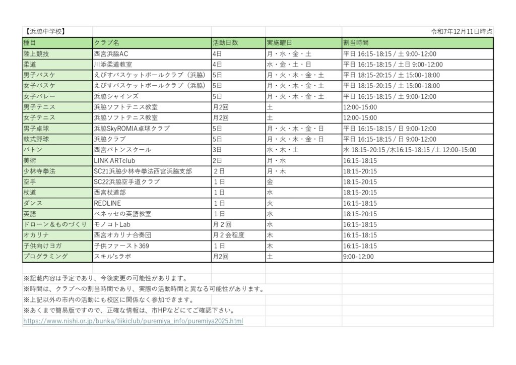 西宮市立浜脇中学校で活動予定のプレみやクラブをまとめてみました。