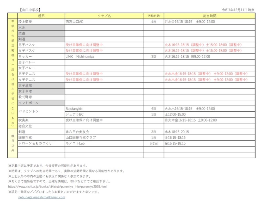 西宮市立山口中学校で活動予定のプレみやクラブをまとめてみました(山口中学校分)。