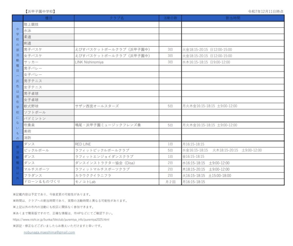 わかり易いように、学校毎に、活動するプレみやクラブを一覧にまとめてみました。