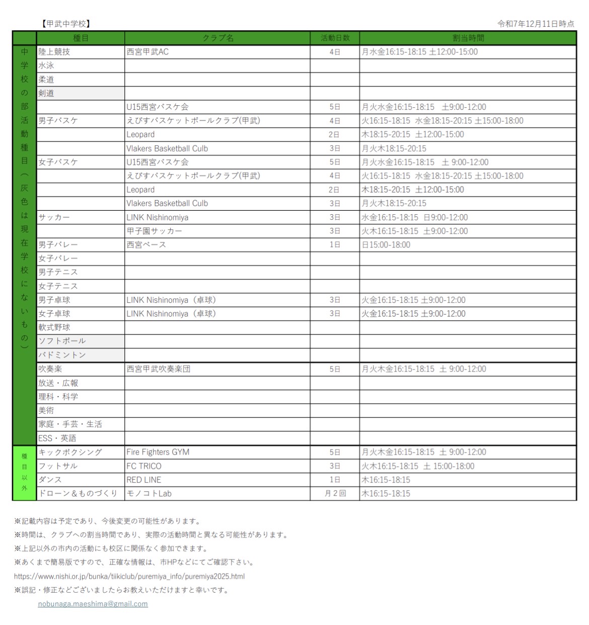 わかり易いように、学校毎に、活動するプレみやクラブを一覧にまとめてみました。